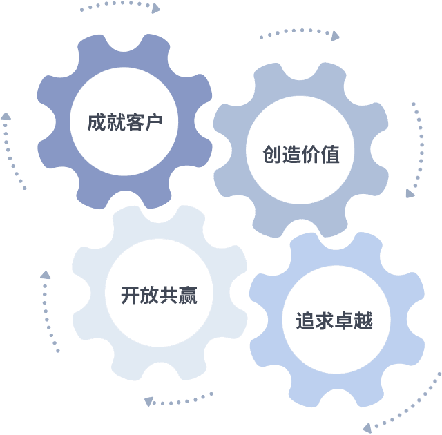 成就客户是一切决策的出发点,,,,创造价值是衡量所有工作的标准,,,追求卓越是我们做事做人的态度,,,,开放共赢是我们的格局也是最终的结果。。。价值观的齿轮环环相扣,,,推动着组织里的每个人不断向前。。